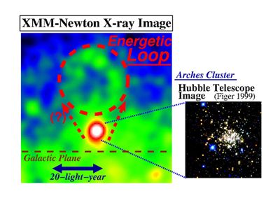 But it is not known whether the loop structure is physically associated with the Arches Cluster or just happens to be in the same line of sight. http://news.bbc.co.uk/1/hi/sci/tech/4423975.stm http://ebulletin.le.ac.uk/news/press-releases/2000-2009/2005/04/nparticle-8xc-wk7-d8c |