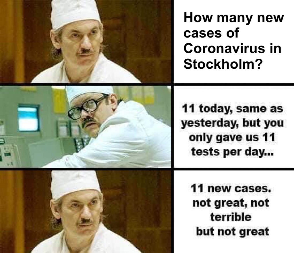 | Mar. 14th, 2020 03:07 pm Zviedru kreisās ierēdniecības "ekspertu" vientiesība nebeidzas vai, precīzāk, izpaužas jo spilgtāk epidēmijas laikos. Zviedrijas galvenais epidemologs: apgalvoja, ka Corona Zviedrijā neizplatīsies, uzstāja, ka tiešo reisu no Ķīnas un Irānas, vēlāk arī Itālijas u.c. ierobežošana ir nevajadzīga, apgalvoja, ka bērnus Corona neskar, tāpēc no riskantajiem reģioniem atgriezušies var taisnā ceļā doties uz skolām, klepoja abās plaukstās preses konferences tiešraidē, kurā vajadzēja sniegt padomus iedzīvotājiem, jau vairākkārt (pirmoreiz pirms apmēram pusotras nedēļas) apgalvoja, ka sasniegts epidēmijas augstākais punkts, sākoties kritiskai situācijai Zviedrijā, aizlidoja komandējumā uz Somāliju palīdzēt apgūt kāda projekta finansējumu, atbildot uz jautājumu par karantīnas ieviešanu, sāka murgot, ka tas nebūšot līdztiesīgi.