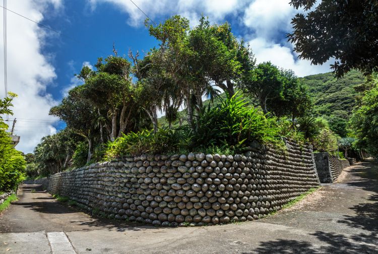 Dziļi Edo laikmetā, kad salu izmantoja kā tādu Sibīriju ar palmām, uz turieni sūtot visus, kuri nepatika tā laika valdībai, karu zaudējušos samurajus un arī noziedzniekus, viens no trimdas dabiem bija apaļu akmeņu stiepšana no jūras uz kalnu un tur no tiem akmeņiem būvēt sienas. Sienas stāv vēl šobaltdien un būdamas ļoti stipras, turas kopā neskatoties uz savu šķietamo trauslumu.