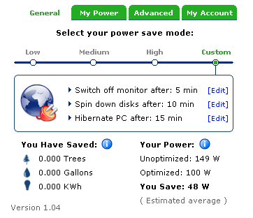 kā arī sakonfigurēt dažādus enerģijas taupīšanas parametrus un redzēt cik daudz tad tas varētu ietaupīt (aptuveni)